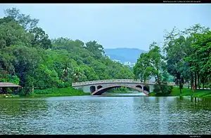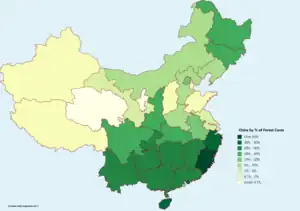 In early 2002, China endorsed the Global Strategy for Plant Conservation providing an approach for preserving the estimated 300,000 to 425,000 species of vascular plants in in situ and ex situ preservation.[17][18] In response to this, The Chinese Academy of Sciences (CAS) established an ex situ conservation program to help efficiently manage the ex situ conservation of indigenous plants in China. Their 12 botanical garden institutions serve as conservation, research as well as public education and with the program, they planned to create five regional gardens, establish nine specialized ones as well as acquire and renovate 15 existing ones. The five regions on which new gardens would be established were the temperate and plain forest of North China; the Yangtze River regional aquatic flora (east-central China); the subtropical monsoon evergreen broadleaved forest (South China); tropical rainforest (southwest China); and the south-central China Henduan mountain flora.[18] In 2008, China's Strategy for Plant Conservation was adopted as a joint initiative of the Chinese Academy of Sciences, the National Forestry and Grassland Administration, and the Ministry of Ecology and Environment.[17] More than 3000 nature reserves have been created, covering approximately 16% of China's land surface. This includes more than 85% of types of terrestrial natural ecosystems, 40% of types of natural wetlands, 20% of native forests, and 65% of natural communities of vascular plants.[19]