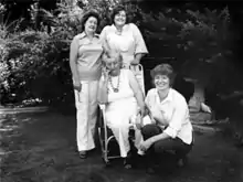 Thompson was hospitalized and her family appealed for financial help in late August 1983.[22] By September, the family had collected $35,000 in donations to pay for her medical care. Thompson died of "stroke, cancer and heart problems" at Scotts Valley, California, on September 16, 1983, at age 80.[23][24] She was buried in Lakewood Memorial Park, in Hughson, California, and her gravestone reads: "FLORENCE LEONA THOMPSON Migrant Mother – A Legend of the Strength of American Motherhood."[25]