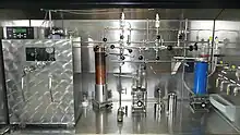 Fluorine gas may be stored in steel cylinders where the inside surface is passivated by a metal fluoride layer that resists further attack.[35][4] Passivated steel will withstand fluorine provided the temperature is kept below 200 °C (400 °F). Above that temperature, nickel is required. Regulator valves are made of nickel. Fluorine piping is generally made of nickel or Monel (nickel-copper alloy).[37] Care must be taken to passivate all surfaces frequently and to exclude any water or greases. In the laboratory, fluorine gas can be used in glass tubing provided the pressure is low and moisture is excluded,[37] although some sources recommend systems made of nickel, Monel, and PTFE.[38]
