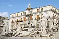 The Praetorian Fountain (Italian: Fontana Pretoria) is a monumental fountain located in Piazza Pretoria in the historic center of Palermo, region of Sicily, Italy. The fountain dominates the piazza on the west flank of the church of Santa Caterina, and is one block south of the intersection of the Quattro Canti. The fountain was originally built in 1544 in Florence by Francesco Camilliani, but was sold, transferred, and reassembled in Palermo in 1574.
