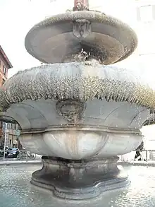 It is one of the first and simplest of Renaissance fountains that would embellish the city. Two circular basins, capture the water, the top ringed by children pouring water from jugs, while above them is the heraldic symbol of the papal family. Commissioned by Pope Sixtus V in 1589, the fountain was designed by Giacomo della Porta and constructed by Andrea Brasca, Pietro Gucci and Pace Naldini. In front of the fountain, once stood the facade of Santi Venanzio e Ansovino, razed and now replaced with by the roads and park-space near the Altare della Patria.