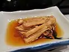 Andong Jjimdak from Andong Mask Dance festival is a local sweet, salty and savory delicacy made with soy sauce marinated chopped chicken simmered with shiitake mushroom, potatoes and dried red chili.[4]