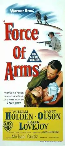Force of Arms (reissued under the title A Girl for Joe) is a 1951 romantic war drama film set in the Italian theater of World War II. It reteamed William Holden and Nancy Olson in the third of their four movies together (Sunset Boulevard, Union Station, and Submarine Command being the others), all released in 1950 or 1951. An American infantryman on leave and a Women's Army Corps (WAC) officer fall in love.
