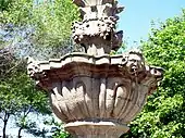 The fusiform column with dish and four carrancas that act as spouts to a larger dish, in the form of a cloverleaf.[1] The fountain is mounted on a small platform preceded by three stairs.[1] The column is decorated with vegetal and zoomorphic sculptures throughout and topped by a sphere and flame-like sculpted burst.[1]