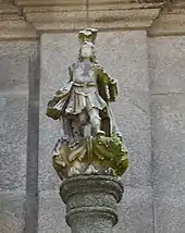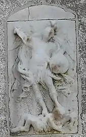 The fountain has a low back and curved profile with wedge-shaped pilasters and an upper cornice forming a curved pediment to the center.[1] A small fountain springs from the central urn to a stone bowl.[1] To the back, wrought iron railing separates the two wedge-shaped urns and central base.[1] The centre is dominated by the main column with lateral curvilinear frontispiece and bas-relief, featuring the Archangel Michael holding a sword and shield and stepping on the devil.[1] The shaft is interrupted by rings and decorative flourishes that rise to support a figure of the archangel Michael.[1]