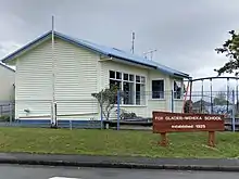 Our Lady of the Snows is a Catholic church located at 60 Cook Flat Road, Fox Glacier, within the South Westland parish of Our Lady of the Woods.[29] The wooden church was built in three months, at a cost of £690, by Robert Emmett Clarke of Whataroa, and includes stained-glass windows and statues donated by settlers in the area in memory of deceased relatives.[30] The Bishop of Christchurch, Matthew Brodie, laid the foundation stone on 22 April 1934, and the church was blessed and dedicated on 15 September 1935 by Bishop Brodie.[30][31]
