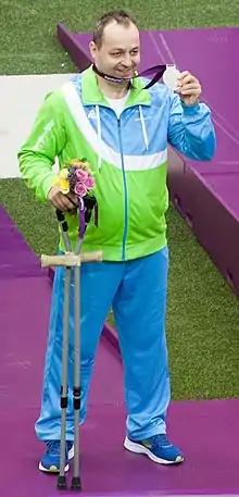 Tiršek at the 2012 Summer Paralympics Mixed R4-10m Air Rifle Standing-SH2 medal ceremony