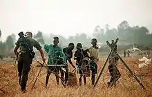 HRW went on to provide that a former French policeman who had also served as security consultant to Habyarimana, Captain Paul Barril, was hired by the Rwandan Ministry of Defense to conduct a training program for 30 to 60 men, eventually to grow to 120, at Bigogwe military camp in the northwest. He was to provide training in marksmanship and infiltration tactics for an elite unit in preparation for attacks behind the RPF lines.[7] Further, a Col. Didier Tauzin (who was later to re-enter Rwanda during the genocide under a fake name Col. Didier Tibault) was head of the French operation that had helped the Rwandan forces "spectacularly save the situation" in turning back the RPF offensive in February 1993.[7] The French claim no evidence exists that these French officers were directly involved in the genocide.[8]