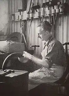 For the next 30 years or so he worked from his small workshop here producing bowls, plates, mirror surrounds and vases in copper, using only hand tools and other simple equipment. All of his designs followed images based on the products of the ancient Celts – particularly those of the La Tène Culture.[1]