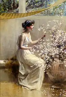 Francis Coates Jones (1857–1932) was an American painter from a wealthy Baltimore family who studied in Europe under painters such as Bouguereau. He is known for his paintings of women at ease in richly decorated interiors or in flower-filled gardens.