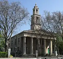The four buildings (all of which survive) have a portico with a tower rising immediately behind it out of the body of the church, after the pattern of St Martin-in-the-Fields, although at Holy Trinity, standing in the southern part of a square, Bedford varied the formula by placing the portico against the long north side of the nave.[8][9] The interiors originally had flat ceilings and galleries supported on columns, although St Luke's was initially designed with a gallery at the west end only.[7] At St John's and St George's, Bedford used an unusual variant of the Doric order based on that of the Choragic Monument of Thrasyllus in Athens, with myrtle wreaths replacing the triglyphs on the frieze.[10] His other two Neoclassical South London churches used the Corinthian order, although one contemporary writer felt the version used at St. Luke's was so bare of ornamentation, that, to the untutored eye it more resembled the Ionic.[11]