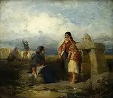 The earliest of Topham's Spanish subjects appeared in 1854, when he exhibited Fortune Telling — Andalusia, and Spanish Gypsies 29,5 x 38,5 cm. These paintings were followed by The Andalusian Letter-Writer and The Posada in 1855, Spanish Card-players and Village Musicians in Brittany in 1857, Spanish Gossip in 1859, and others, mainly Spanish. In the autumn of 1860 he paid a return visit to Ireland, and in 1861 exhibited The Angel's Whisper and Irish Peasants at the Holy Well. In 1864 he began to exhibit Italian drawings, sending Italian Peasants and The Fountain at Capri, and in 1870 A Venetian Well.[1]