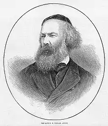 Topham first visited Ireland in 1844 and 1845, with Frederick Goodall and Alfred Fripp.[2] His career as watercolourist appears to have started self-taught, helped by practice at the meetings of the Artists' Society in Clipstone Street. He was in 1850 one of Charles Dickens's company of actors (the "splendid strollers") in The Rent Day of Douglas Jerrold and Bulwer Lytton's Not so bad as we seem. Towards the end of 1852 he went for a few months to Spain in search of the picturesque.[1]