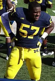 In Clark's first two years at Michigan he added over 60 pounds (27.22 kg), without losing any speed.[3] On September 21, he had 1.5 sacks against Connecticut,[15] including one on third down during Connecticut's final possession as the 2013 Wolverines clung to a 24–21 lead.[16] He also had two sacks against Penn State on October 12 and ran back a fumble recovery for a touchdown, although it was not enough to help Michigan avert its first loss of the season.[15][17] Following the regular season, he was recognized as a second-team All-Big Ten selection by the coaches and an honorable mention selection by the media.[18][19] On November 16, 2014, Clark was arrested for domestic violence and dismissed from the football team.[20]