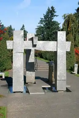 The artwork cost $15,000 and was described by Kelly as "a symbol of human involvement with the annual renewal of nature".[5] The Oregonian writers Janet Goetze and Jean Henninger described the memorial's crossed columns as "like an ancient architectural structure" and "something like Stonehenge", respectively.[6][7] In her book The Garden Lover's Guide to the West (2000), Kathleen McCormack said the fountain "provides cooling water music for hot summer days in the garden".[8]