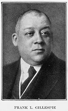 Frank L. Gillespie (November 8, 1876 – May 8, 1925) was a businessman who created the first African American-owned life insurance agency outside of the U.S. southern states.[1][2] Gillespie had been an agent at Royal Life Insurance Company, a white-owned insurance agency, working in the "department for colored people" and noticed his customers were offered "inferior products."[3][2] He met with a group of prominent black businessmen in Chicago and they worked together to create an insurance company catering towards Chicago's professional African American population.[1]