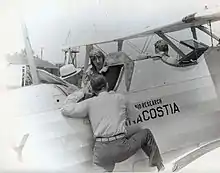 Lieutenant Frank Akers (wearing flight helmet) shows Rear Admiral Ernest J. King (wearing civilian hat), the chief of the Bureau of Aeronautics, the cockpit of the OJ-2 in which he performed the Navy's first demonstration of a blind landing system intended for use on board aircraft carriers. He made the landing "under the hood" at College Park, Maryland.