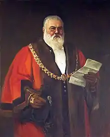 His interests turned in later years to politics and public service, which led him to serve in 1891 as president of the Anchor Society, a charitable organisation in Bristol that looked after the old and infirm. He went on to city politics, becoming in 1908 a city councillor, then in 1910–11 the Lord Mayor of Bristol.[6][3] He was knighted on 28 June 1912 by King George V during a royal visit to the opening of the Edward VII Memorial Wing of the Bristol Royal Infirmary in Bristol.[7] He was also a Justice of the Peace, and died a much respected citizen on 26 March 1932 in Bristol, where he is buried in the Arnos Vale Cemetery.[8] A portrait of him by an unknown artist hangs in the Mansion House of Bristol City Council.[9]