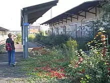 Greenery on the approach to the platform. In background: signal box and road bridge