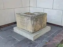 The 1887 courthouse's cornerstone and several of its entranceway columns are located at the James A. Karnes Building.[14] The cornerstone was stored in a garage near Dorrian (then Franklin) Commons Park rescued from a garbage dump in 1977, after having been accidentally carted off.[15] In 1979, it was utilized as a planter by the county's horticulturalist, who fit five plants' roots into the hole that formerly held a copper box time capsule.[16] The cornerstone, first opened in October 1974, held a 15-pound copper box containing newspapers, government reports, and a city directory.[17]