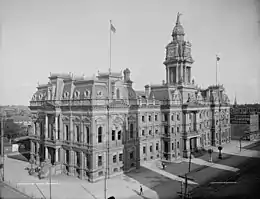 A $500,000 bond issue vote taken in 1884[6] prompted the construction of a new courthouse and jail. George H. Maetzel was the appointed architect. Plans began to demolish the existing structures on the site, and space was rented for office and court space, while a temporary building was constructed to hold the county records. The judge of the court of common pleas appointed a building commission in April 1884 to work on the courthouse plans. The commission visited other cities to learn about architecture, interior space uses, and project costs. The building's cornerstone was laid on July 4, 1885, accompanying a parade and celebration.[7] The building was dedicated on July 13, 1887, on the hundredth anniversary of the passage of the Northwest Ordinance. It had a cost of $470,000.[4] At the time of its opening, and for years thereafter, the building was considered only second to the Ohio Statehouse in grandeur.[3]