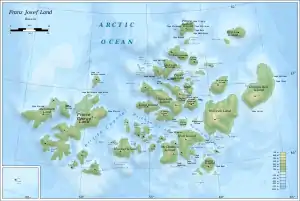 Franz Josef Land[lower-alpha 1] (Russian: Земля́ Фра́нца-Ио́сифа, romanized: Zemlya Frantsa-Iosifa; Norwegian: Fridtjof Nansen Land) is a Russian archipelago in the Arctic Ocean. It is inhabited only by military personnel.[1] It constitutes the northernmost part of Arkhangelsk Oblast and consists of 192 islands, which cover an area of 16,134 square kilometers (6,229 sq mi), stretching 375 kilometers (233 mi) from east to west and 234 kilometers (145 mi) from north to south. The islands are categorized in three groups (western, central, and eastern) separated by the British Channel and the Austrian Strait. The central group is further divided into a northern and southern section by the Markham Sound. The largest island is Prince George Land, which measures 2,741 square kilometers (1,058 sq mi), followed by Wilczek Land, Graham Bell Island and Alexandra Land.