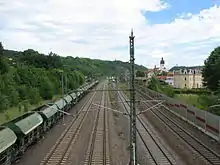 The resulting high traffic density on the railway congested and delayed traffic. The situation was further intensified with the start-up of the tramway through the Plauenscher Grund (the valley of the Weißeritz between Plauen and Freital) in 1902. The exit from Potschappel towards Dresden created a chokepoint, which could only be eased by the raising of the railway from 1905 to 1909.[5] As a result of the upgrading, reconstruction work was also carried out at the entrance building erected in 1855. The railway was upgraded to four tracks, with work completed in 1914, allowing passenger and goods traffic to be handled separately at Potschappel station. During this time, signal box B1 was built, which is still preserved one and under heritage protection.[6]