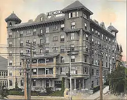 The hotel briefly appears in the background near the end of Charlie Chaplin's 1914 debut film, Making a Living, during a fight scene on the road.[7] The Fremont Hotel is also shown twice in the 1950 film noir feature Backfire starring Gordon MacRae and Virginia Mayo. George F. Fellows was arrested in his room in March 1927 for broadcasting on the radio.[8] Though it billed itself as "[t]he newest and most elegantly appointed family hotel in Los Angeles",[9] by 1948, the hotel was a dilapidated and ill maintained establishment.[2][4] The hotel was demolished by 1955 by the Community Redevelopment Agency, and what remained was only the retaining wall next to the Olive Public School.[4]