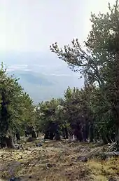View through a grove of Rocky Mountain Bristlecone Pine growing on the south slope of Fremont Peak, Flagstaff is visible in the background