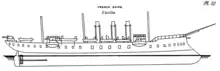 Profile drawing of Amiral Cécille as depicted in The Naval Annual in 1887; note it mistakenly omits the amidships sponson for the main battery, which was located abreast the rear funnel[5]