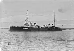 Gloire, named after Glory,[7] was authorized in the 1896 Naval Program and was ordered from the Arsenal de Lorient on 17 September 1898. The ship was laid down on 5 September 1899, launched on 27 June 1900, and completed on 28 April 1904.[8] The cost of her construction was 22,081,725 francs. The ship was assigned as the flagship of Rear Admiral (Contre-amiral) Joseph Bugard, commander of the 1st Cruiser Division (1re Division de croiseurs) of the Northern Squadron. Gloire had been relieved as flagship by 4 August 1905.[9] Together with her sisters Condé and Amiral Aube, Gloire escorted the remains of John Paul Jones from France to Annapolis, Maryland, in April 1906 and then went on to visit New York City.[10] The 2nd Cruiser Division had been formed by January 1907 and Gloire was the division's flagship.[11] On 7–8 August the ship participated in the bombardment of Casablanca, the first step in the French conquest of Morocco.[12] By October 1907 she was the flagship of Rear Admiral Joseph-Alphonse Philibert.[11]