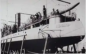 During World War I, Étendard was torpedoed and sunk by an Imperial German Navy destroyer in the North Sea off Dunkirk, France, with the loss of all hands on 25 April 1917.[1]