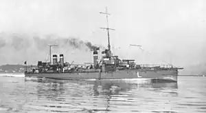 Lansquenet was ordered from Dyle et Bacalan and was launched at their shipyard in Bordeaux on 20 November 1909. She was completed in October 1910.[4] When the First World War began in August 1914, Lansquenet was assigned to the 2nd Destroyer Flotilla (2e escadrille de torpilleurs) of the 1st Naval Army (1ère Armée Navale). During the preliminary stages of the Battle of Antivari, Montenegro, on 16 August, the 1st, 4th and 5th Destroyer Flotillas were tasked to escort the core of the 1st Naval Army while the 2nd, 3rd and 6th Flotillas escorted the armored cruisers of the 2nd Light Squadron (2e escadre légère) and two British cruisers. After reuniting both groups and spotting the Austro-Hungarian protected cruiser SMS Zenta and the destroyer SMS Ulan, the French destroyers played no role in sinking the cruiser, although the 4th Flotilla was sent on an unsuccessful pursuit of Ulan. Having broken the Austro-Hungarian blockade of Antivari (now known as Bar), Vice-Admiral (Vice-amiral) Augustin Boué de Lapeyrère, commander of the 1st Naval Army, decided to ferry troops and supplies to the port, escorted by the 2nd Light Squadron and the 1st and 6th Destroyer Flotillas while the rest of the 1st Naval Army bombarded the Austro-Hungarian naval base at Cattaro, Montenegro, on 1 September. Four days later, the fleet covered the evacuation of Danilo, Crown Prince of Montenegro to the Greek island of Corfu. The 2nd Flotilla bombarded Stončica Lighthouse on the island of Lissa on 19 September. The flotilla escorted multiple small convoys loaded with supplies and equipment to Antivari, beginning in October and lasting for the rest of the year, always covered by the larger ships of the Naval Army in futile attempts to lure the Austro-Hungarian fleet into battle. The Naval Army raided Lissa and the island of Lastovo on 2 November with Lansquenet entering Vis harbor and extorting a ransom from the townsmen lest the French bombard the town. As they departed, the French shelled the lighthouse again.[5]