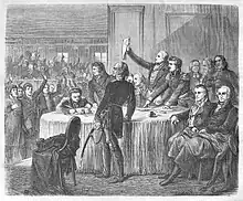 Dohna came into opposition to Karl August von Hardenberg and left office in November 1810. He returned to his estates in East Prussia and organized a meeting of the Prussian estates in Königsberg with Ludwig Yorck von Wartenburg on 5 February 1813 after the Convention of Tauroggen. Here Dohna was elected the Chairman of the Commission of People's Armament and organized the resistance against the retreating French troops after Napoleon's Russian campaign.[3]