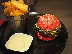 A "Parliamentary Election Burger" (a variety of the normal Dry Aged Burger with a red bun), along with French fries and dip sauce