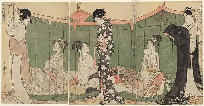 Fujin Tomari-kyaku no Zu Sanmai-tsuzuki (婦人泊り客之図三枚続, "Triptych Picture of Women Overnight Guests", c. 1794–1795) is a triptych print by the Japanese ukiyo-e artist Kitagawa Utamaro (c. 1753–1806). It depicts a group of women within a mosquito net preparing for an overnight visit.
