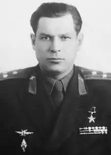 After the end of the war he remained in the military, graduating from the Lipetsk Higher Officer Aviation School in June before returning to his wartime regiment as assistant commander of the air rifle service, where he remained until February 1946. After graduating from the Air Force Academy of Monino in May 1951 he was made commander of a training regiment in the Stalingrad Military Aviation School based in Novosibirsk. Starting in December 1952 he was based in Estonia, where he served as a flight inspector of the 58th Fighter Aviation Corps until December 1955, after which he became a senior flight inspector in a training department, and from August 1958 until he retired from the military in mid 1959 he served as a senior flight navigator at the Yeisk Military Aviation School of Pilots. During his career he piloted the Yak-9, MiG-15, and MiG-17. From then to 1961 he worked at Vnukovo Airport, and from 1961 to 1962 he worked at the helicopter maintenance department for the Rassvet OKB design bureau. From 1962 to 1964 he was an inspector at a Moscow carburetor factory for the trade union city committee, and from 1963 to 1965 he was a senior engineer at the Mossanelectroprom trust. He briefly served as a senior engineer-economist in the planning department of the Ministry of Civil Aviation starting in February 1965, but left in September that year. In the first half of 1966 he worked as a senior engineer at the Ministry of Local Industry of the RSFSR, from 1966 to 1967 he was senior engineer of the technical department of the Central Union of Consumer Societies, and from 1967 to 1969 he was head of a department in the Ministry of Rural Construction of the RSFSR, having graduated from the Moscow Engineering and Economic Institute in 1968. For several months in 1969 he held the post of deputy head of a department in the Ministry of Agriculture, and later that year he worked as senior engineer of a trust in the Ministry of Communications. From 1970 to 1974 he worked at the technical documentation department of the Mosblorgtekhstroy trust. From 1974 to 1975 he worked as deputy head of the department for accounting and distribution of housing of the Bauman district council of Moscow, and after that he became a chief project engineer at the Mosblorgtekhstroy trust, where he rose to the position of deputy managing director before becoming a senior safety engineer at the Mossanelectroprom trust in 1982. He later worked as the deputy director of the Mosoblstroypogress State Unitary Enterprise, where he remained until retiring in 2004. He lived in Moscow for the remainder of his life, where he died on 28 December 2012 and was buried in the Troyekurovskoye cemetery.[1]