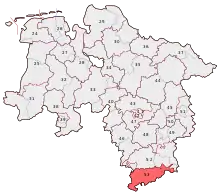 Göttingen is located in southern Lower Saxony. As of the 2021 federal election, it comprises the district of Göttingen excluding the municipalities of Bad Grund, Osterode am Harz, and Walkenried, the Samtgemeinde of Hattorf am Harz, and the Harz area.[1]