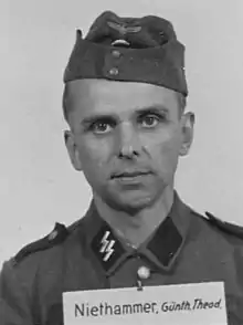 Niethammer was born in Waldheim, the eighth son of Konrad Niethammer, a paper manufacturer (owner of Kübler & Niethammer paper mills) and politician. After studying zoology at Tübingen in 1927 he moved to Leipzig in 1929 and then worked on the anatomy of the avian crop under J. Meisenheimer.[1] Through Hans Kummerlöwe, also in Leipzig, he met Erwin Stresemann who gave him the task of compiling the Handbuch der Deutschen Vogelkunde. The publication of the first volume led to a position as a curator at the Museum Koenig in Bonn from 1937 and he continued to work on the remaining two volumes, the last published in 1942. In 1937, Niethammer joined the Nazi party (Number 5613683) and in early 1940 he volunteered with the Luftwaffe as he had a flying license. Due to his age, he was rejected and he then tried to join the Wehrmacht which also refused to admit him. He then joined the armed unit, Waffen-SS, in May 1940. He was posted to Oranienburg and shortly after to Auschwitz concentration camp where he was posted at gate G as a part of the security team. Opposite gate G was a gravel pit where prisoners were routinely killed. He made a request to the camp commander Rudolf Höss for alternate duty and towards March 1941 he was given "special ornithological duty" nearby and Niethammer published on the birdlife of the Auschwitz area. There were many fishponds around the area which had dykes that were made of ash from burned prisoners. Niethammer hunted ducks nearby which were shared with Höss and son Klaus.[2] A prisoner named Grembocki helped in preparation of specimens.[3]
