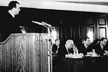 The constitution of the country was closely modeled on that of the Soviet Union, and insisted on the leading role of The Party. Government Ministers held their posts at the pleasure of The Party and their job was to carry out The Party Central Committee decisions. Potential tensions arising from this situation were reduced by the fact that many ministers were also members of the Party Central Committee. Günther Wyschofsky was listed as a candidate for membership in January 1963, and after a wait of less than two years was elected one of the approximately 121 members of the Central Committee in December 1964.[6] Later he was also Chairman, for the East German side, in the bilateral Economic Committees of the German Democratic Republic with Iran and with China.[7]