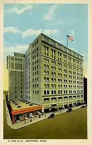 G. Fox & Co. was established in 1847 by Gerson Fox and his brother, Isaac Fox, and was named I. & G. Fox Co. The first G. Fox store was a single-room storefront opened in Hartford, Connecticut.[1] When Isaac sold his interest to his brother, Gerson renamed the company G. Fox and Company. Gerson's son, Moses, joined the business in 1863, and took over the store in 1880, upon Gerson's death. The early Fox store was famous for home delivery - by wheelbarrow. The store had grown to five floors when it burned to the ground in January 1917.[1] Moses Fox, 66 at the time, announced that work would begin immediately on an 11-story replacement structure.[2] The new flagship store was located at 960 Main Street in downtown Hartford. History has it that the original store and offices, destroyed by fire, were rebuilt because the store's customers rallied and paid approximately 95% of all outstanding bills - voluntarily. Encouraged by the response, Moses Fox had the new store designed by New York architect Cass Gilbert,[1] as an 11-story behemoth, initially dubbed "Fox's folly" in reference to its sheer scale. The new store opened in 1918.[1] The fire served as impetus for Beatrice Fox Auerbach, Moses's daughter, and her husband, George Samuel Auerbach, to return to Hartford from Salt Lake City to help with the business. George died in 1927 and Beatrice then began working alongside her father.