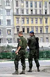 117. Two United Nations peacekeepers stand amidst the war-damaged buildings. One soldier is armed with a G3A3 rifle. Subject Operation/Series: PROVIDE PROMISE Base: Sarajevo Country: Bosnia And/I Herzegovina (BIH)