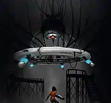 In Portal, GLaDOS is the only witness to the situation of the player character, Chell. The game begins with GLaDOS introducing Chell to the game's Aperture Science Laboratories Enrichment Center and the physics of the portal gun. As Chell navigates through the center, GLaDOS admits to having lied to Chell about her progress, as part of a supposed "test protocol".[3] GLaDOS slowly becomes more sinister, and Chell's trust in GLaDOS is tested when the AI directs Chell into a testing area populated with live-fire turrets, a course designed for military androids. The AI claims that the regular test chamber is unavailable due to "mandatory scheduled maintenance".[4] GLaDOS uses the lure of cake and grief counseling to encourage Chell to continue,[5] but at the final testing area, as Chell prepares to receive the supposed cake, GLaDOS attempts to incinerate Chell in a fire pit. Once Chell escapes, GLaDOS attempts to reconcile with Chell, claiming the pit was a final test.[6]