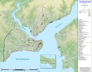In the 11th century, the quarter housed the city's Jewish community, which came to number some 2,500 people.[2] In 1171, a new Genoese settlement in the area was attacked and nearly destroyed.[3] Despite Genoese averments that Venice had nothing to do with the attack, the Byzantine Emperor Manuel I Komnenos (r. 1143–1180) used the attack on the settlement as a pretext to imprison all Venetian citizens and confiscate all Venetian property within the Byzantine Empire.[3] The kastellion and the Jewish quarter were seized and destroyed in 1203 by the Catholic crusaders during the Fourth Crusade, shortly before the sack of Constantinople.[2]