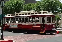 The Galveston Island Trolley is a heritage streetcar network in Galveston, Texas, United States. As of late 2006, the total network length was 6.8 miles (10.9 km) with 22 stations. The Galveston Island Trolley is operated by Island Transit. The rail system reopened in 2021, after having been out of service for 13 years following severe damage caused by Hurricane Ike in 2008. Subsequent to the 2008 closure, the Federal Emergency Management Agency (FEMA) and the Federal Transit Administration agreed to fund repairs.[1] In January 2017, a contract was approved to restore three of the trolleys at a cost of $3.8 million.[2] At that time, the trolleys were expected to be ready to return to service in 2018,[3][4] but the date was later postponed to 2019[5] and later to 2021. By November 2020, two reconditioned trolleys had returned to Galveston.[6] The line reopened for service in October 2021, limited to three days a week for now.