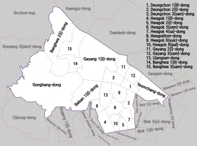 The Korea Airports Corporation headquarters,[2] Korean Air's headquarters, Korean Airport Service, Ltd., and Air Total Service are located in Gonghang-dong in Gangseo District.[3][4] Asiana Airlines's headquarters are located in Asiana Town in Osoe-dong, Gangseo District.[5] Jin Air has its headquarters in Deungchon-dong, Gangseo District.[6] Eastarjet has its headquarters in Banghwa 2-dong.[7]