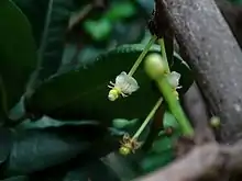 It is an evergreen small tree, growing to 6–18 m tall. The leaves are borne in opposite pairs or whorls of 3–4, each leaf blue-green, oval, 6–11 cm long and 3–5.5 cm broad. The flowers are produced in clusters on the stems. The fruit is a small, bright, orange, thin-skinned berry 1–4 cm diameter, with one single large seed; the small yield of edible fruit is pleasantly sweet, yet acidic, but also containing a latex that some people find unpleasant.[3][4]