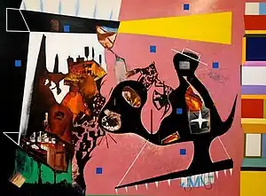 Best known for introducing new themes and subject-matter into Australian art and being one of the first Australian artists to be influenced by Pop art, particularly British Pop artists like Peter Blake, Allen Jones, Derek Boshier, Joe Tilson and the formal strategies of the post-modernist R. B. Kitaj. Another major Influence was and remains the British painter Francis Bacon. He was an associate of Brett Whiteley and there was a likely mutual influence. Sansom has had a distinct influence on subsequent Australian art, paving the way for later notable artists such as Juan Davila and Howard Arkley. His work is represented by the National Gallery of Australia, the National Gallery of Victoria, the Art Gallery of New South Wales, the Metropolitan Museum of Art, New York and the Mertz Collection. His paintings are eclectic, studded with allusions both historical, cultural and personal. There is something almost diaristic about his work, but its presentation is anything but linear and logical. Abiding themes are mortality, ageing, sexual identity, popular and youth culture and cinema. There is also a strong element of humour, iconoclasm and irony in his work, from their titles, such as "Art Can't Fart (for Rose Selavay)", "Four Wise Men Looking for God in Abstract Art", "Dr Fu Manchu's Death by Gyro" or "Ship of Fools (Hello sailor!)" to comic and grotesque figurative elements and their sometimes lurid but highly resolved colour schemes. On a technical level his paintings combine oils, enamels (both sprayed and applied with brush) and collaged elements from personal photographs to objects stuck on or painted over. Stylistically Sansom uses a wide array of painting techniques but signature devices include allowing earlier layers of paint to remain visible, hard-edge geometric shapes juxtaposed with playful, lyrical, more organic or atmospheric passages of paint and figurative "doodles", often at the margins of the paintings.
