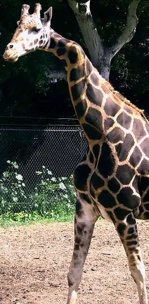 Gemina (July 16, 1986 January 9, 2008) (pronounced Jeh-MEE-nah)[1] was a 12-foot-tall (3.7 m) Baringo giraffe[2] who lived in the Santa Barbara Zoo in Santa Barbara, California.[2] She became notable for the peculiar deformity in her neck, which was bent by almost ninety degrees between her C3 and C4 vertebrae. The deformity was not present when she was born, in the San Diego Wild Animal Park, but first became noticeable when she was three years old.[2]