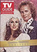 For a February collector's edition issue, People magazine ran a special cover honoring the 50th anniversary.[21] TV Guide, itself celebrating its 60th anniversary with a special edition issue, had an in-depth four-page feature about General Hospital's anniversary and a full-page advertisement for the event on its back cover.[22] The feature reflected on the show's troubled state a year before the anniversary, its resurgence, and past revivals.[23] For the back cover, the magazine depicted an image from the 1981 wedding of Luke and Laura formed by a collage of images from the show.[24][25] Both the feature and back cover ad were well received by soap opera commentators.[22][23]